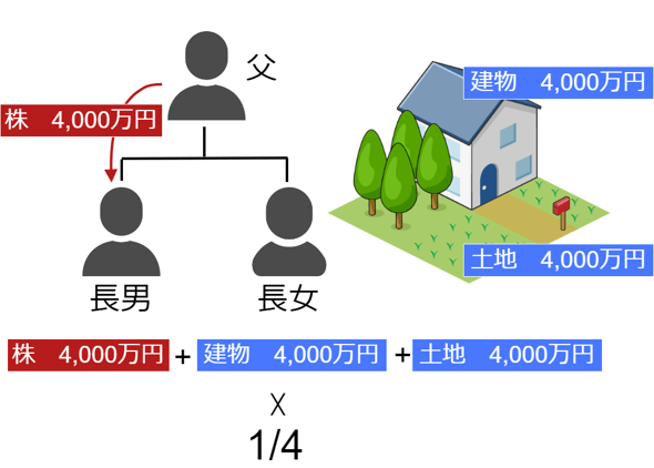 お父さんと長男・長女がいて、お父様が亡くなりました。亡くなった時にお父さんの財産としては建物と土地がありました。それぞれ評価が4000万円です、といったような場合です。