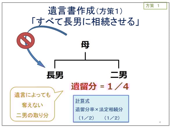 ・相続人が2人(長男・二男)→ 二男の遺留分:1/4