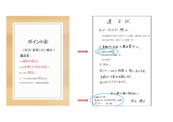 一度書いた遺言書を訂正変更したい場合は、『遺言者がその場所を指示し、これを変更した旨を付記して特にこれに署名し、かつその変更の場所に印を押さなければならない』というのは民法の書きぶりですが、なんのこっちゃか分からないかと思います。