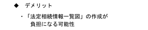 (法務局HPより:https://houmukyoku.moj.go.jp/homu/content/001394035.pdf ) <デメリット> 一方で、後ほどご説明しますが、法定相続情報証明制度を利用する際は、戸籍謄本を1セット集め、これを読み解きながら「法定相続情報一覧図」を作成し、提出しなければなりません。これ自体が手間ではあります。