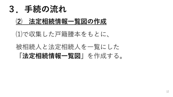 ⑴で収集した戸籍謄本をもとに、被相続人と法定相続人を一覧にした「法定相続情報一覧図」を作成します。