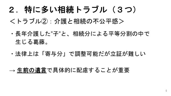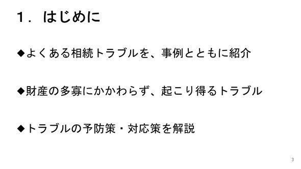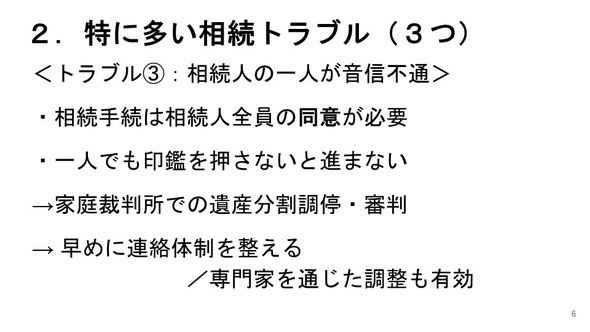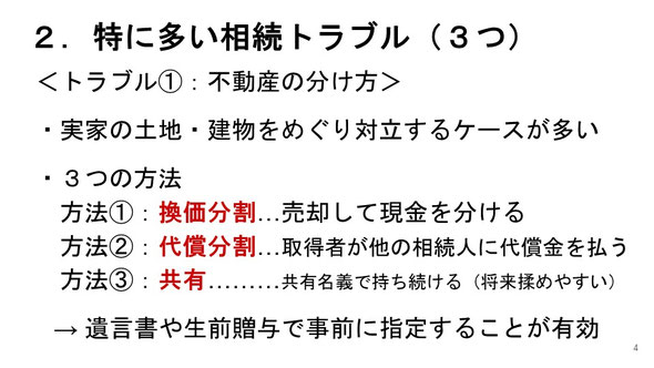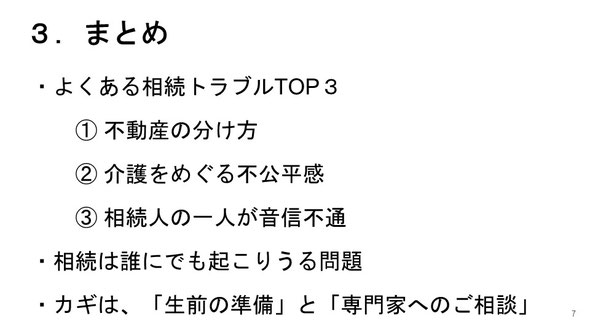 1つ目は不動産の分け方、2つ目は介護をめぐる不公平感、3つ目は音信不通の相続人がいる場合。これらを防ぐカギは、まずは被相続人側の「生前の準備」ではないかと思います。